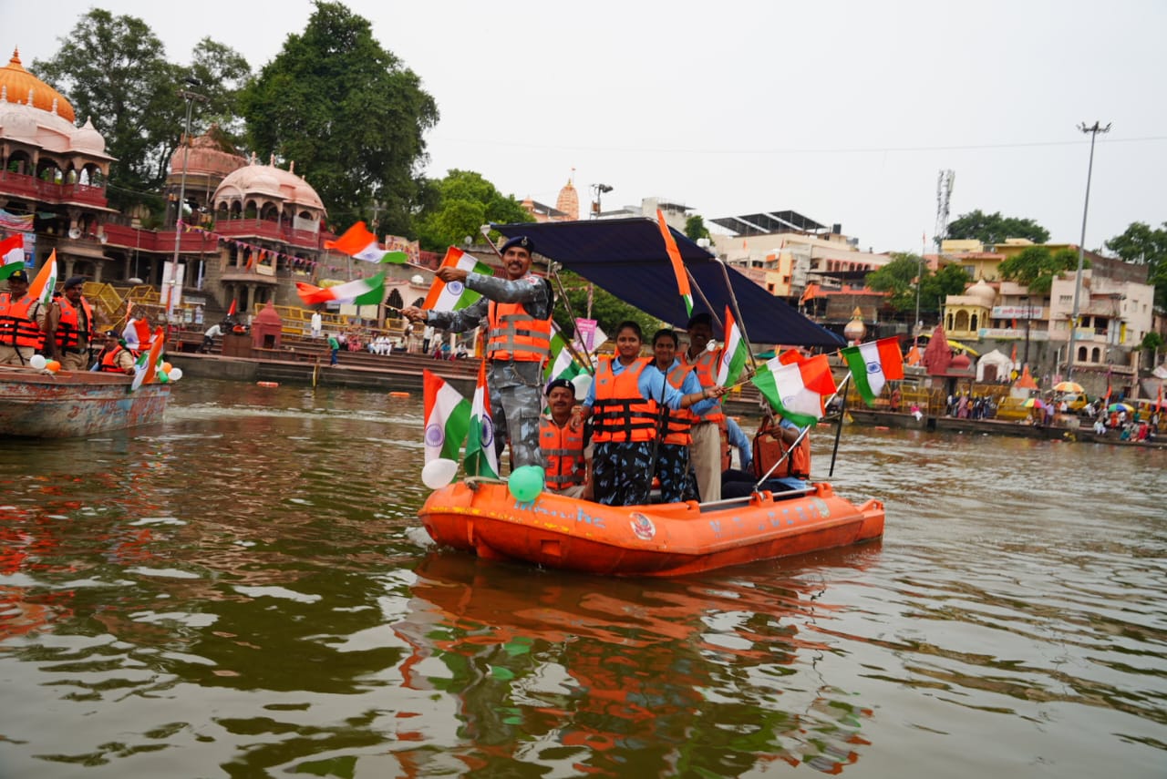 उज्जैन,आजादी के अमृत महोत्सव एवं स्वतंत्रता दिवस पर चलाए जा रहे हर घर तिरंगा, हर घर स्वच्छता अभियान अंतर्गत गत दिवस शाम 5 बजे नरसिंह घाट से राम घाट तक नाव के माध्यम से भव्य तिरंगा यात्रा का आयोजन किया गया। यह यात्रा होमगार्ड और एसङीईआरएफ की कुल 6 बोटों से सम्पन्न हुई।