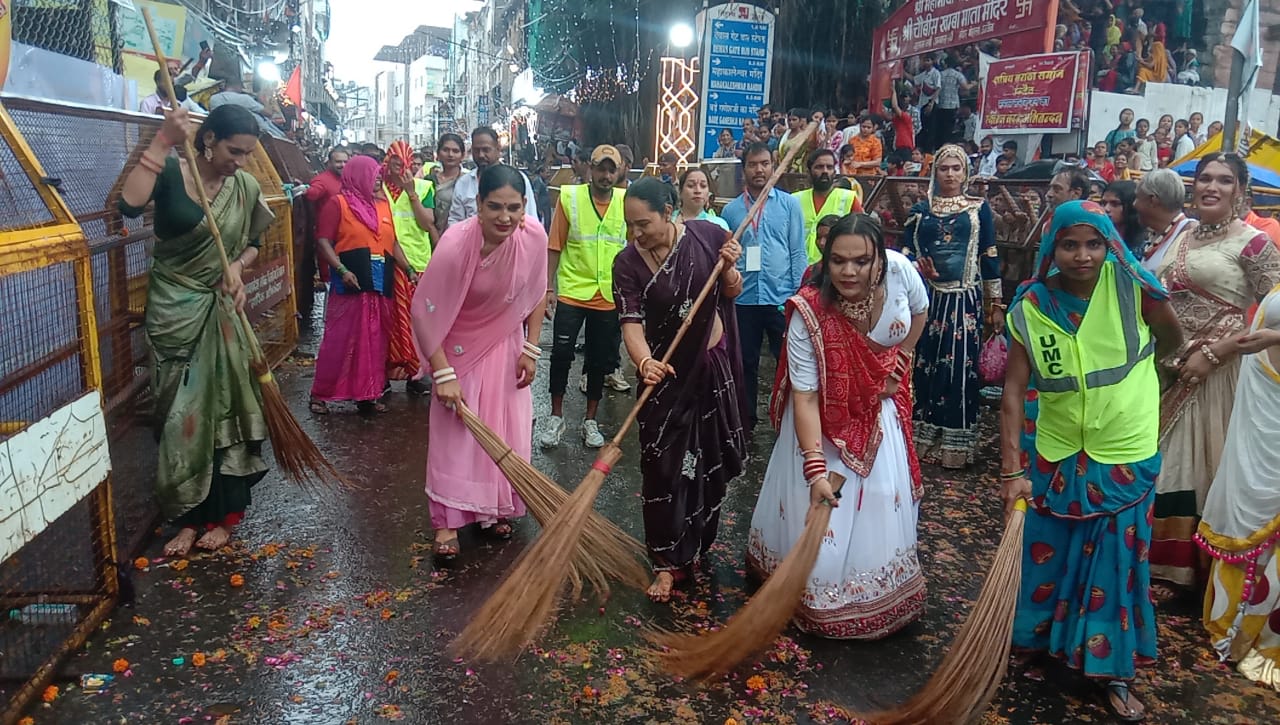 आगे आगे बाबा महाकाल की पालकी चली वही पीछे नगर निगम के सफाई मित्रों द्वारा तत्काल मार्ग को साफ एवं स्वच्छ किया गया इसके साथ ही सफाई मित्रों का हौसला बढ़ाते हुए किन्नर समाज द्वारा भी अपने हाथों में झाड़ू थाम कर सफाई मित्रों के साथ सवारी मार्ग की सफाई की गई।
