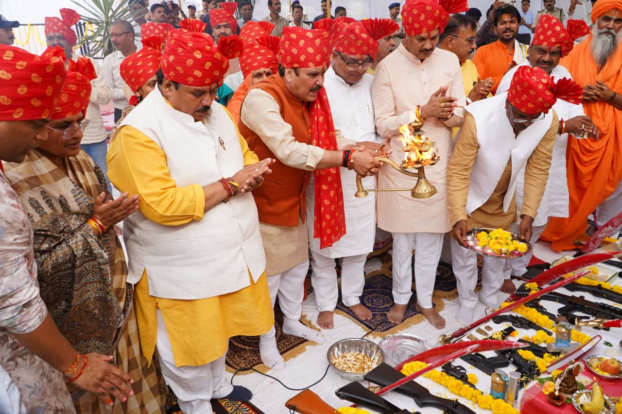 इस दौरान राज्यसभा सांसद बालयोगी उमेश नाथ जी महाराज, विधायक श्री अनिल जैन कालूहेड़ा, विधायक श्री सतीश मालवीय, महापौर श्री मुकेश टटवाल, नगर निगम सभापति श्रीमती कलावती यादव, कलेक्टर श्री रौशन कुमार सिंह, पुलिस अधीक्षक श्री प्रदीप शर्मा ,अपर कलेक्टर श्री प्रथम कौशिक, सीईओ जिला पंचायत श्री श्रेयांस कूमट, श्री संजय अग्रवाल ,श्री नरेश शर्मा ,श्री जगदीश पांचाल एवं अन्य गणमान्य नागरिक उपस्थित थे। सभी ने शस्त्र पूजन के पश्चात नागरिकों को दशहरे पर्व की शुभकामनाएं दीं।
