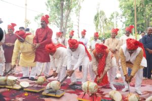 जनप्रतिनिधियों व अधिकारियों ने पारंपरिक साफा पहन कर वैदिक विधि विधान से शक्ति स्वरूपा मां काली की पूजा-अर्चना व आरती की गई। इसके पश्चात प्रतिकात्मक स्वरूप कद्दू को काटकर बलि दी गई, साथ ही घोड़ों को गुड़ खिलाया गया और वाहन की पूजा भी की गई।