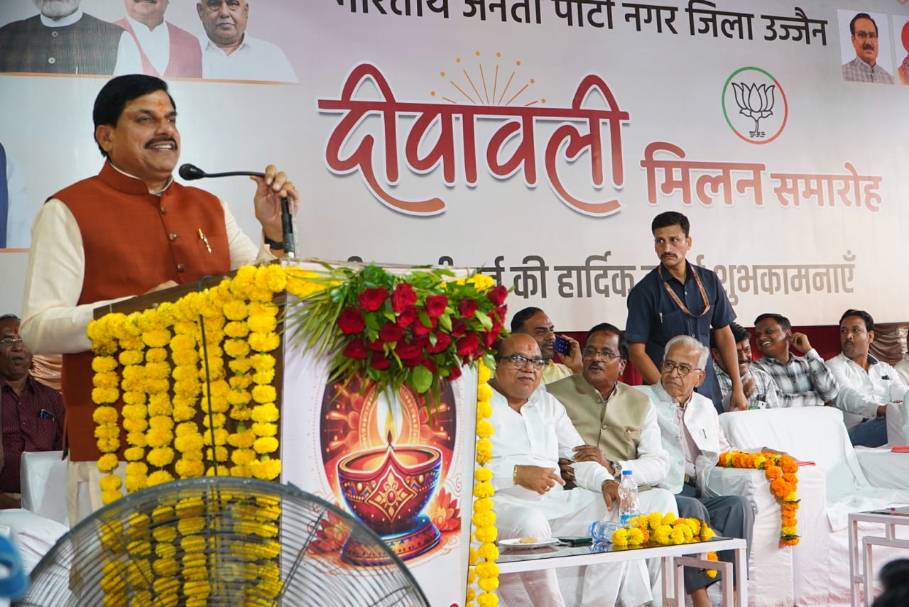 मुख्यमंत्री डॉ. यादव रविवार को उज्जैन में दीपावली मिलन समारोह को संबोधित कर रहे थे। इस दौरान भूतपूर्व केंद्रीय मंत्री डॉ. सत्यनारायण जटिया, विधायक श्री अनिल जैन कालूहेडा, महापौर श्री मुकेश टटवाल, श्री संजय अग्रवाल, निगम अध्यक्ष श्रीमती कलावती यादव, राज्य वक्फ बोर्ड अध्यक्ष डॉ. सनवर पटेल, श्री रूप पमनानी, श्री वीरेंद्र कावड़िया, श्री विवेक जोशी आदि उपस्थित थे।