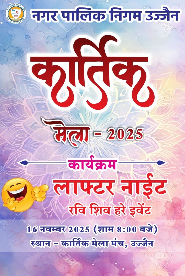 उज्जैन,नगर पालिक निगम उज्जैन द्वारा कार्तिक मेला सांस्कृतिक मंच पर प्रतिदिन आने वाले नागरिकों के मनोरंजन हेतु सांस्कृतिक कार्यक्रमों का आयोजन किया जा रहा है इसी क्रम में रविवार को लाफ्टर नाइट का आयोजन किया गया है*
