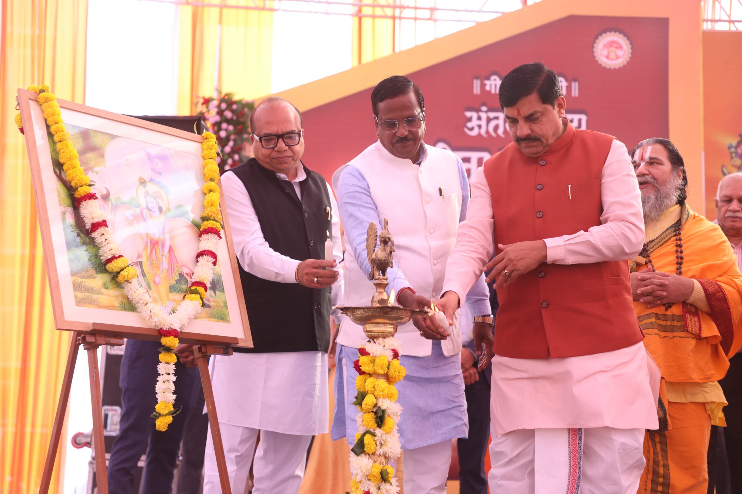 उज्जैन, मुख्यमंत्री डॉ. मोहन यादव के मुख्य आतिथ्य में सोमवार को 03 दिवसीय अन्तर्राष्ट्रीय गीता महोत्सव का आयोजन उज्जैन के दशहरा मैदान से किया गया। मुख्यमंत्री डॉ. यादव ने इस अवसर पर सभी को गीता जयंती की शुभकामनाएं देते हुए कहा कि जगत के गुरु भगवान श्रीकृष्ण को हम सभी नमन करते हैं । कुरूक्षेत्र के युद्ध स्थल में मोह ग्रस्त अर्जुन को भगवान श्री कृष्ण द्वारा दिये गये उपदेश और उनके महत्व को समझने व आत्मसात करने के लिए आज गीता जयंती पर अन्तर्राष्ट्रीय गीता महोत्सव का आयोजन किया जा रहा है ।