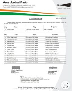 उज्जैन, मध्य प्रदेश में संगठन विस्तार को लेकर पार्टी को अधिक सक्रिय और प्रभावी बनाने के लिये आम आदमी पार्टी के केंद्रीय नेतृत्व द्वारा मध्यप्रदेश में झोन कॉर्डिनेटर के पद की मीडिया टीम की सूची जारी की गई है। यह घोषणा केंद्रीय नेतृत्व के निर्देशानुसार प्रदेश प्रभारी जितेंद्र सिंह तोमर के नेतृत्व में की गई है।