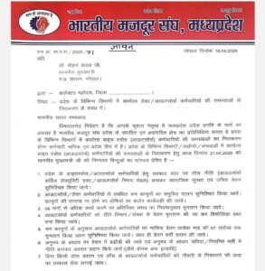 उज्जैन, भारतीय मजदूर संघ मध्य प्रदेश द्वारा उज्जैन मे प्रदेश के विभिन्न विभागों में कार्यरत ठेका/आऊटसोर्स कर्मचारियों की समस्याओं के निराकरण के संबंध विषयांतर्गत निवेदन आपके कुशल नेतृत्व में मध्यप्रदेश प्रदेश प्रगति के मार्ग पर अग्रसर है भारतीय मजदूर संघ प्रदेश के संगठित एवं असंगठित क्षेत्र का प्रतिनिधित्व करता है प्रदेश के विभिन्न विभागों में कार्यरत बाह्य स्त्रोत (आऊटसोर्स) कर्मचारियों की समस्याओं का निराकरण होना कर्मचारी श्रमिक एवं प्रदेश हित में है। प्रदेश के विभिन्न विभागों / उद्योगों / संस्थाओं में कार्यरत बाह्य स्त्रोत (आऊटसोर्स) कर्मचारियों की समस्याओं के निराकरण हेतु दिनांक 21.04.2026 को माननीय मुख्यमंत्री जी को निम्नवत बिन्दुओं का मांगपत्र प्रेषित है:-