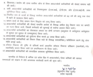 9. सभी आऊटसोर्स कर्मचारियों को नियमानुसार ई.एस.आई., ई.पी.एफ. और ई.एस.आई.सी. लाभसुनिश्चित किया जाये।